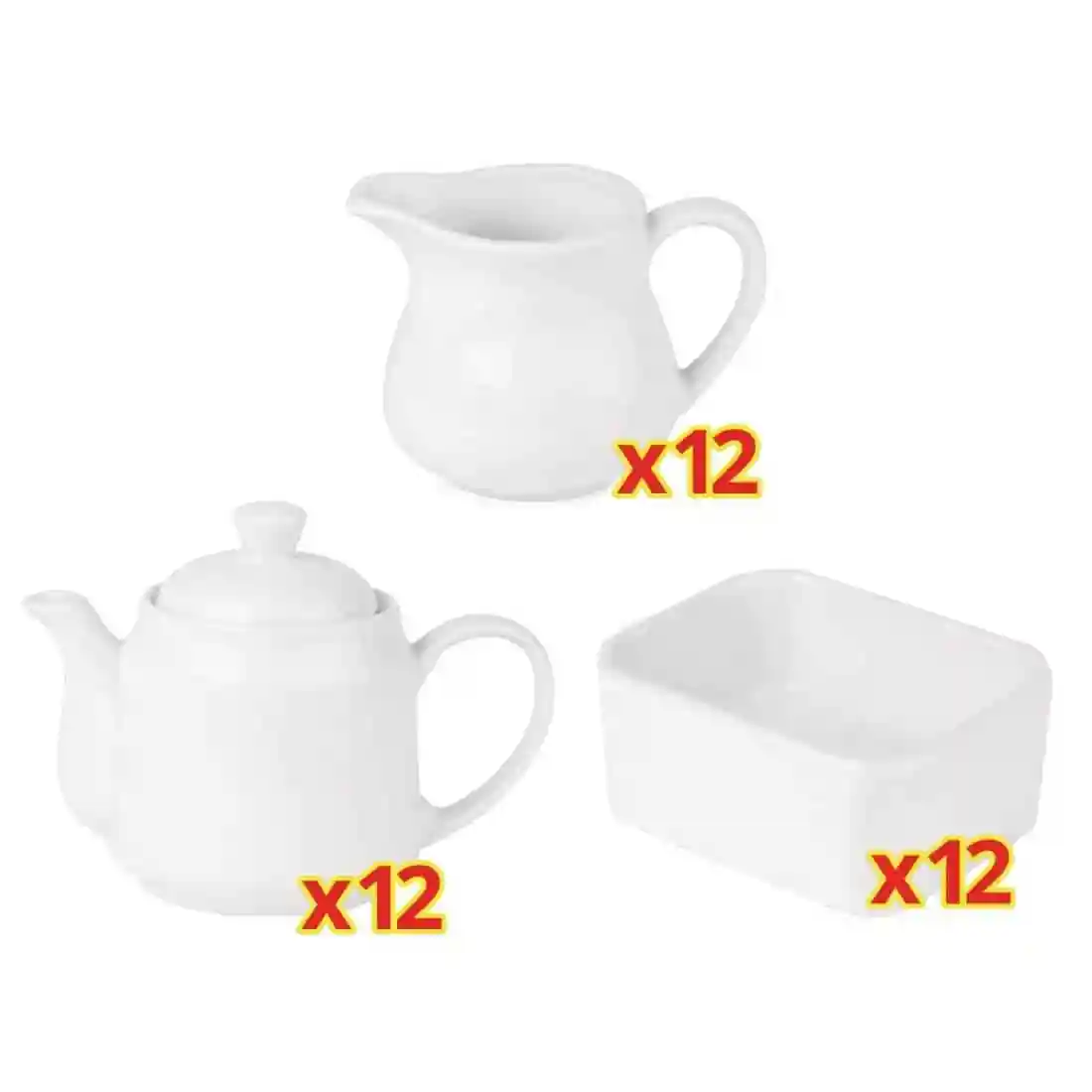 A great value tea service set including 12 x 430ml Beverage pots, 12 x 170ml Milk Jugs and 12 x Sachet Holders.