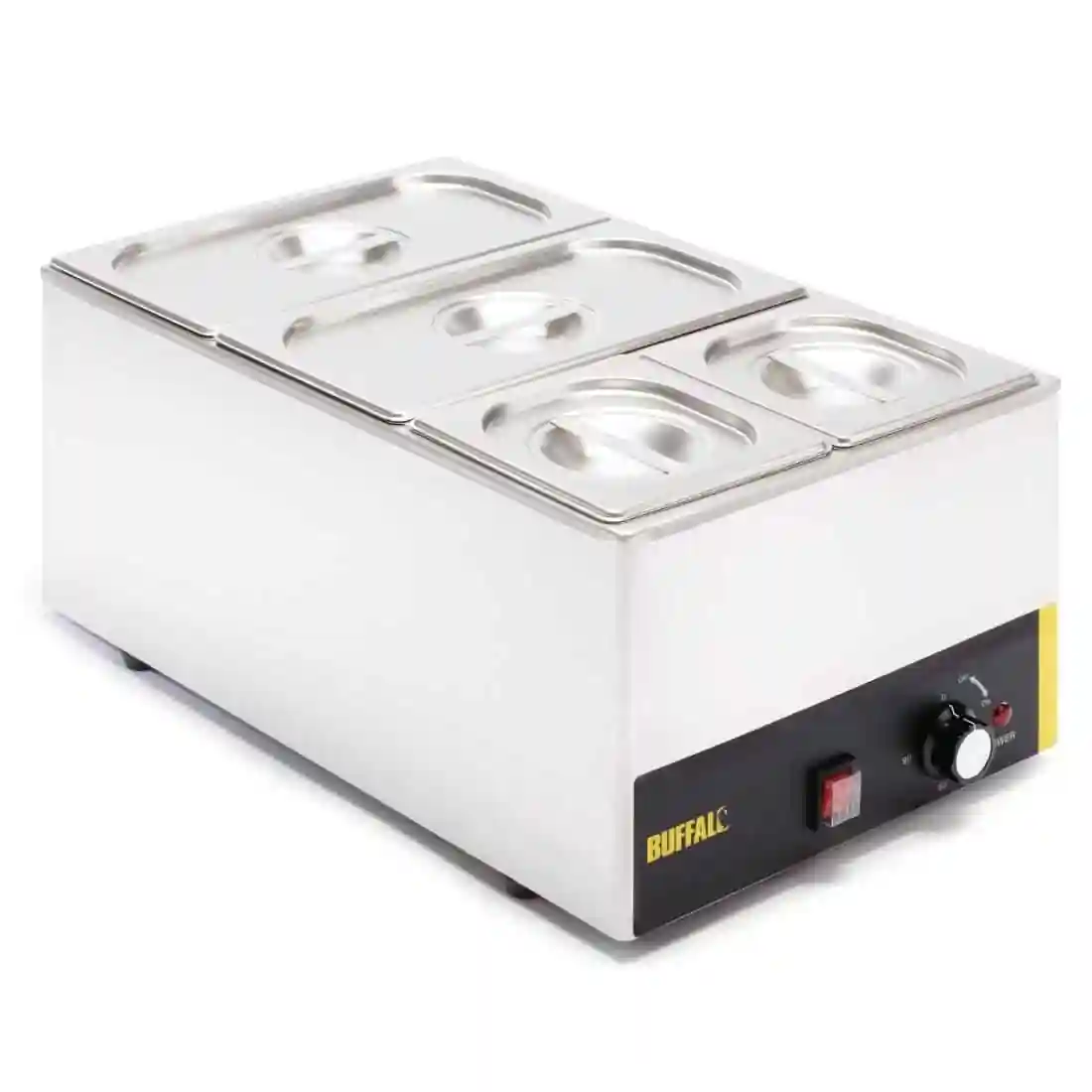 This Buffalo bain marie benefits from a durable stainless steel construction and is supplied complete with pans, lids, support bars and fitted plug.