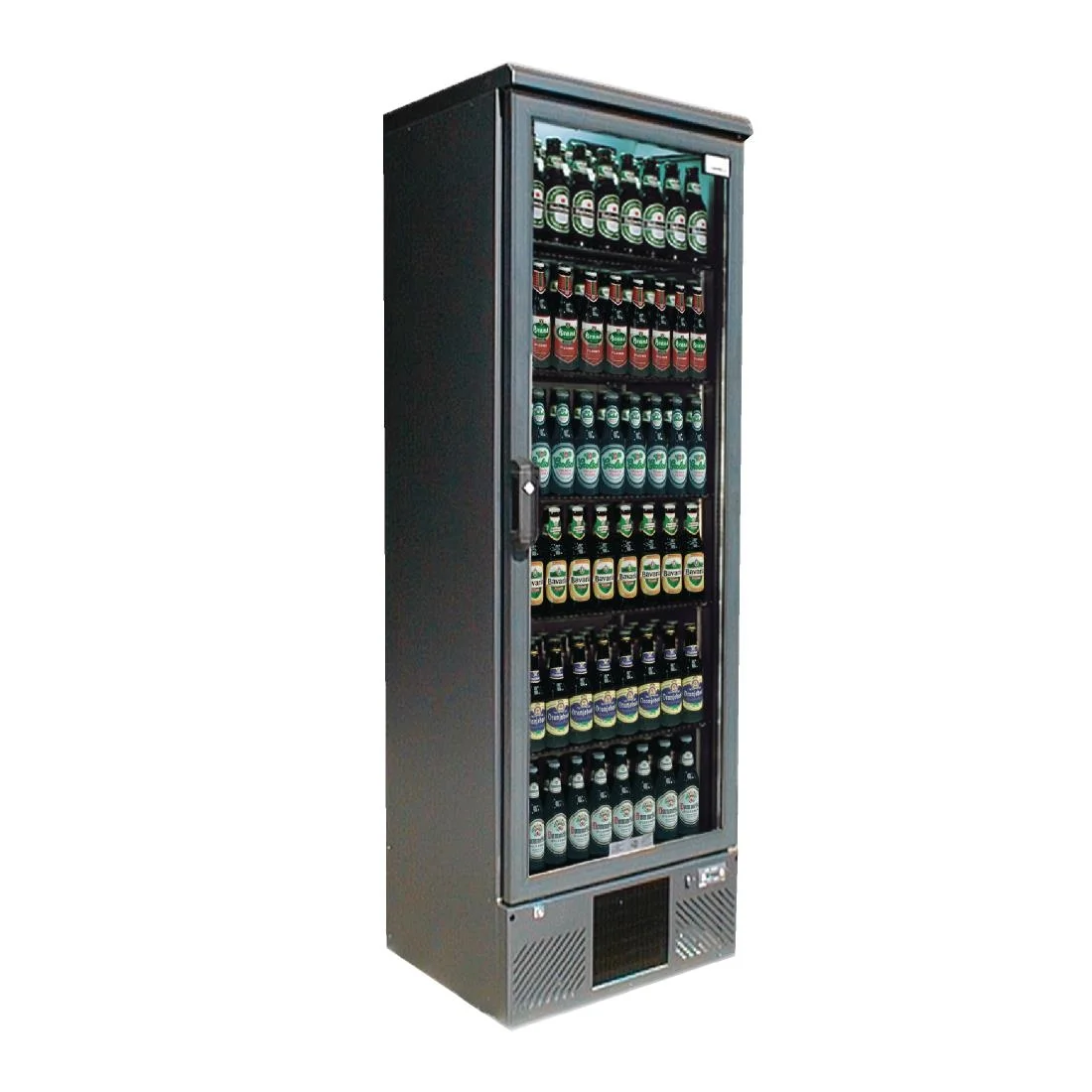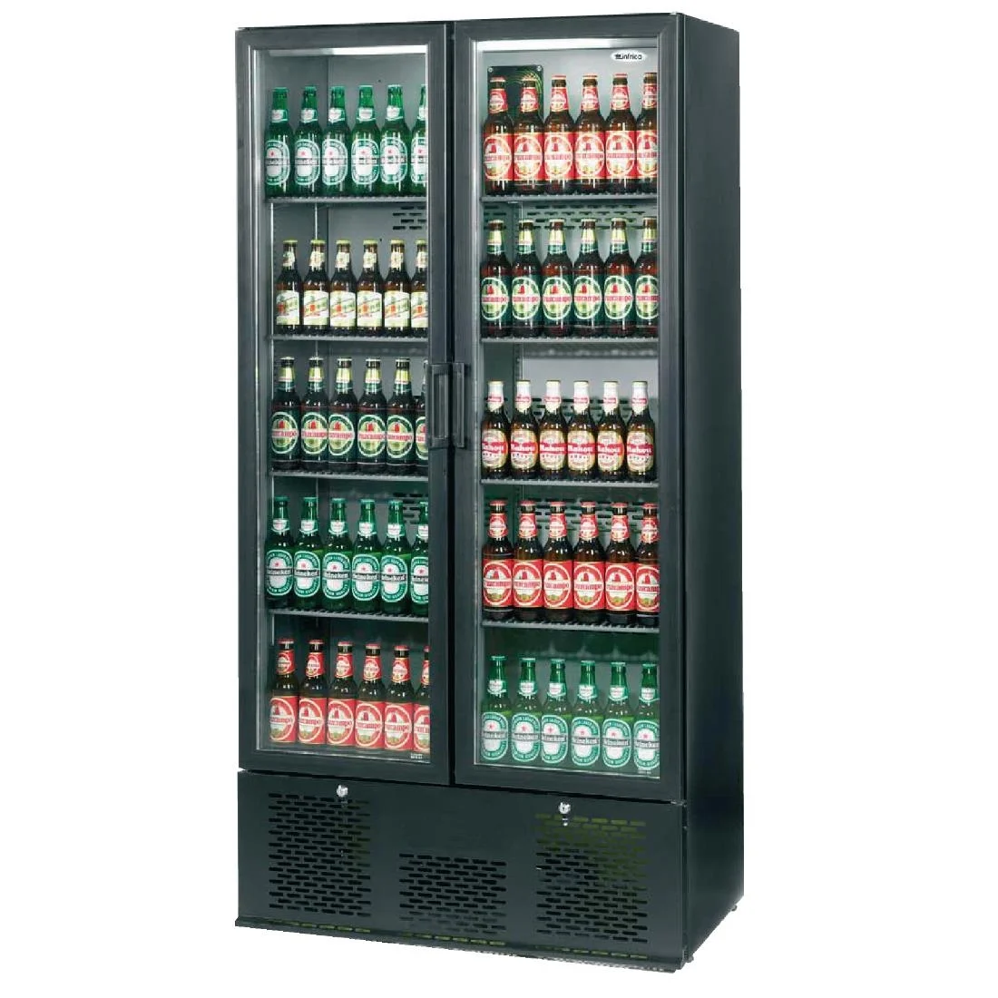 Hinged Doors. R600a Refrigerant. Capacity for 490 x 330ml bottles (at 60mm diameter).