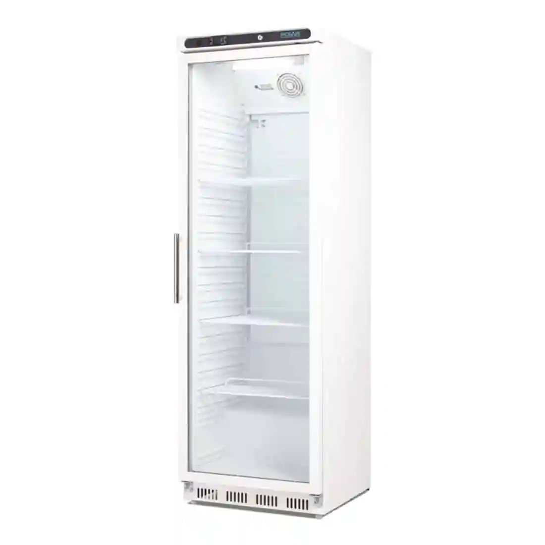 The large double-glazed glass door and LED lighting ensures efficient operation and highlights the contents across the four adjustable shelves to maximise sales. Digital controls make the fridge simple to use, whilst the attractive white finish is simple to keep clean.