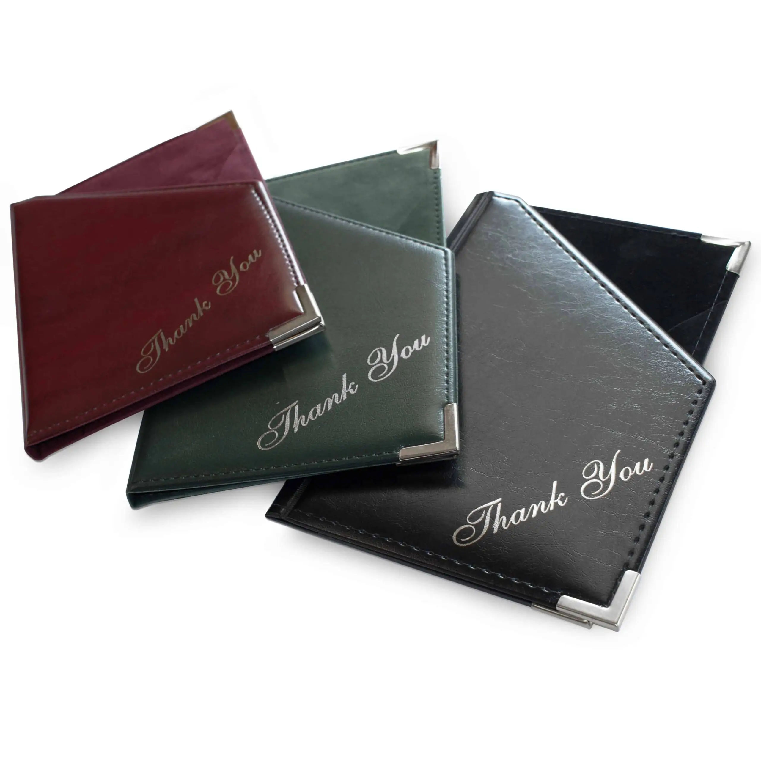 The Tivoli Bill Holder is a cost effective product designed to present your restaurant adn bar receipts and retain change safely and professionally. These Bill Presenters are manufactured from a padded PVC material and with the look of leather, this A5 bill holder is lined with a suede-like material. Available in red, blue, green and black, this receipt holder gives you a good variety to choose from. Whats more, this bill holder includes silver or gold corner protectors and foil lettering.