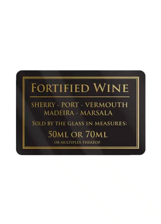 Our Fortified Wine Measurements Notice comes in the form of a black bar sign. This sign shows that fortified wine will be served in units of 50ml and 70ml in accordance to the capacity measures regulations policy for fortified wine glass sizes. The bar sign is in compliance of UK licensing standards.
