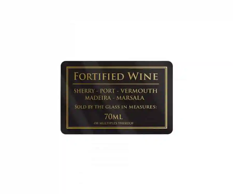 Our Fortified Wine Measurements Notice comes in the form of a black bar sign. This sign shows that fortified wine will be served in units of 70ml in accordance to the capacity measures regulations policy for fortified wine glass sizes. The bar sign is in compliance of UK licensing standards.