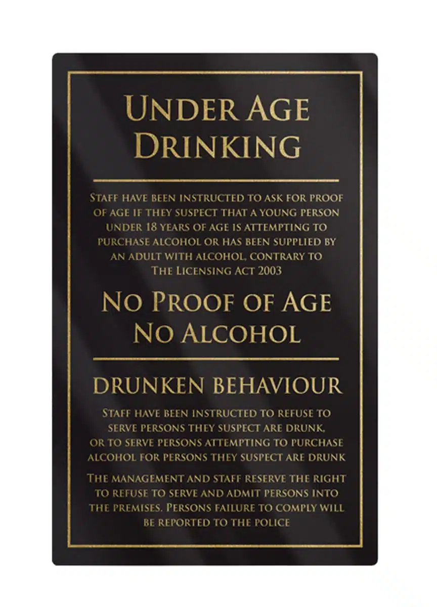 This black bar sign send a firm message that under age drinking is not tolerated within these premises. Show your staff and customers that you are promoting identification checks to comply with the Licensing act. This bar sign also includes a drunken behaviour notice, informing guests that staff can refuse service to anyone who is displaying drunken behaviour.