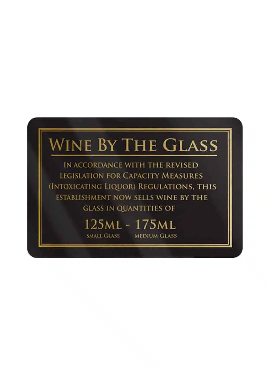 Our Wine by the Glass Notice comes in the form of a metal bar sign. It has a modern brushed silver finish. This sign shows a 125ml (small) and 175ml (medium) weights & measurements policy for wine glass sizes. The bar sign is in compliance of UK licensing standards.