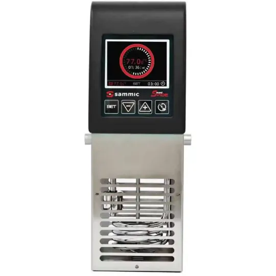 Good sous vide cooking requires absolutely accurate temperature control and the Sammic SmartVide5 offers all the necessary precision, reliability and convenience for the best results. Useful for chefs on the move or for those who cook sous-vide infrequently, the portable SmartVide5 can be quickly attached to a gastronorms or round pots and programmed to cook food without constant monitoring. Features precise temperature regulation of 0.01°C increments, regulated by the top mounted, easy-to-use TFT screen.