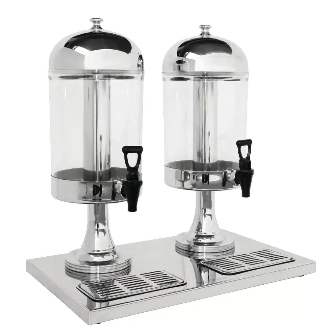 Large capacity self service beverage dispensers for juice, milk, tea and coffee.