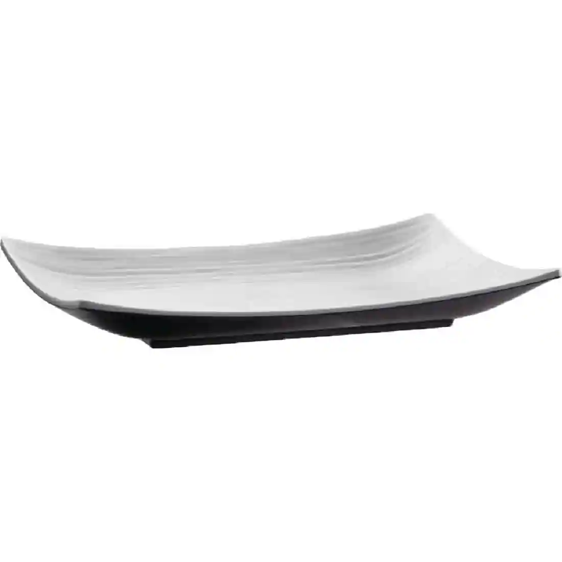 This APS melamine curved rectangular platter from the dual tone range is ideal for presenting food at buffets or other events. The white platter has got a black exterior with a matt surface which provides a modern and stylish edge to your buffets and other functions.