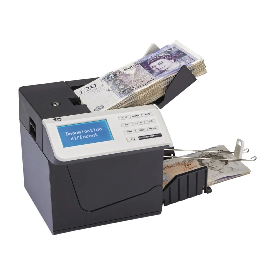 Counts banknotes and coins. Inbuilt rechargeable battery