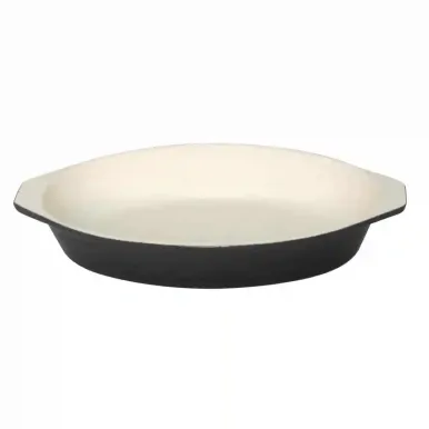 Cast iron ensures even heat distribution.Cream enamelled interior.When properly seasoned, provides long life non-stick and rust free pan.All sizes are internal dimensions.Works with all heat sources; gas, electric, induction and ceramic top ranges.Attributes of cast iron means hot food stays hot for longer, providing greater energy efficiency.