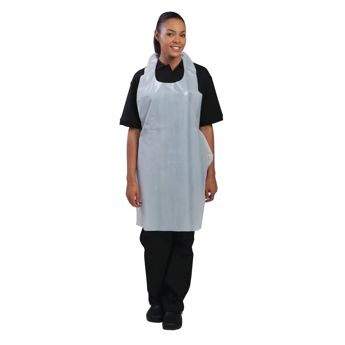 Help reduce the spread of germs with disposable blue aprons. Sold in packs of 100, these single-use disposable polythene bib aprons provide an effective barrier, protecting staff uniforms and skin.