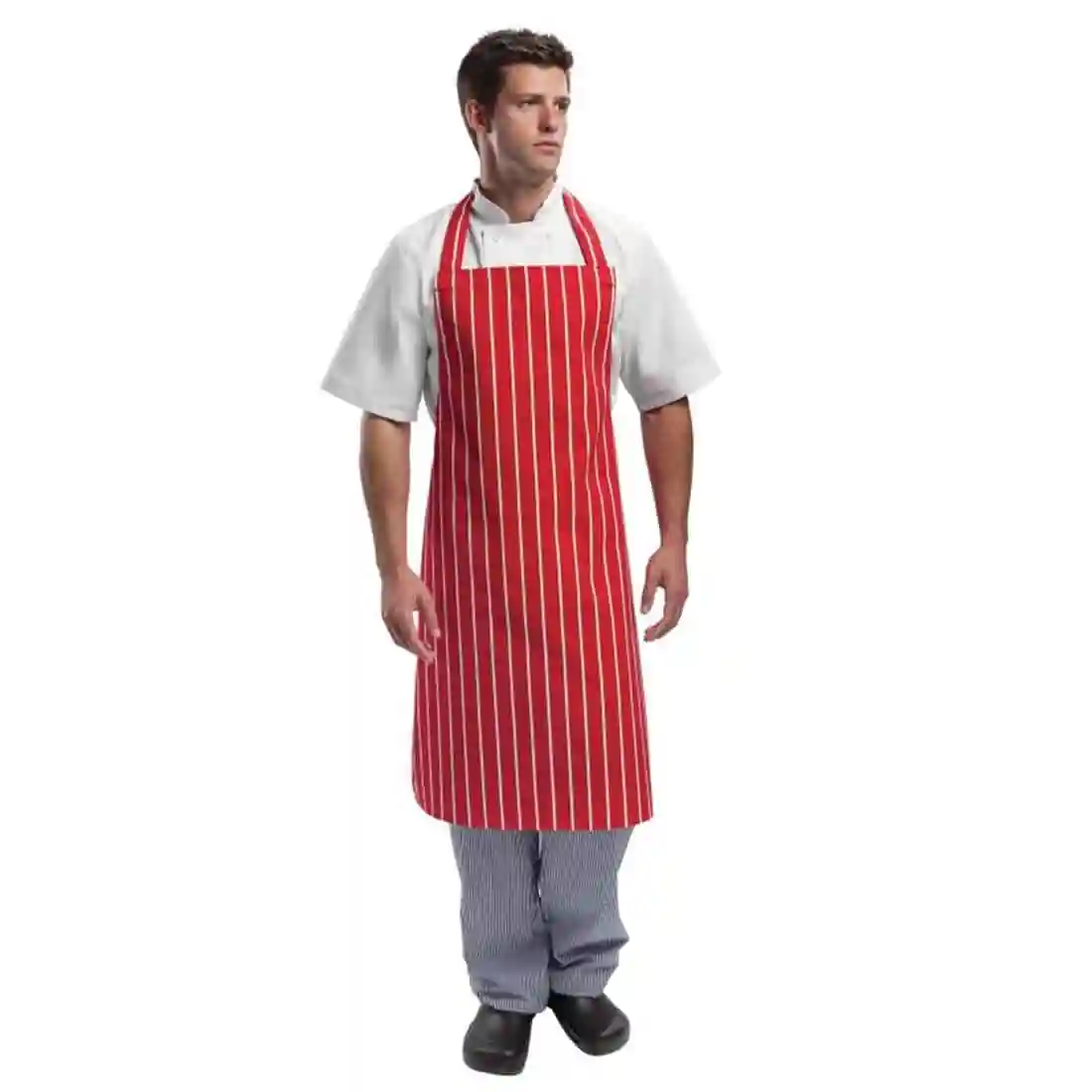 Stylish and durable, the Whites Bib Apron with red and white stripes is the perfect addition to any professional kitchen.
