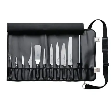 Chefs Knife, Utility Knife, Slicer, Fillet Knife, Boning Knife, Paring Knife, Tourne Knife, Carving Fork, Spatula, Steel, Melon Baller and Roll Bag