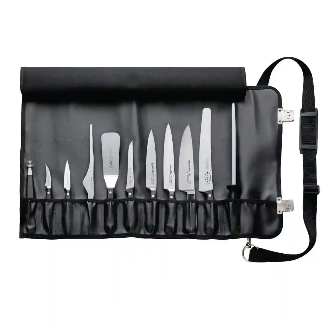 Heavy duty lockable roll knife bag containing an 11-piece knife set.