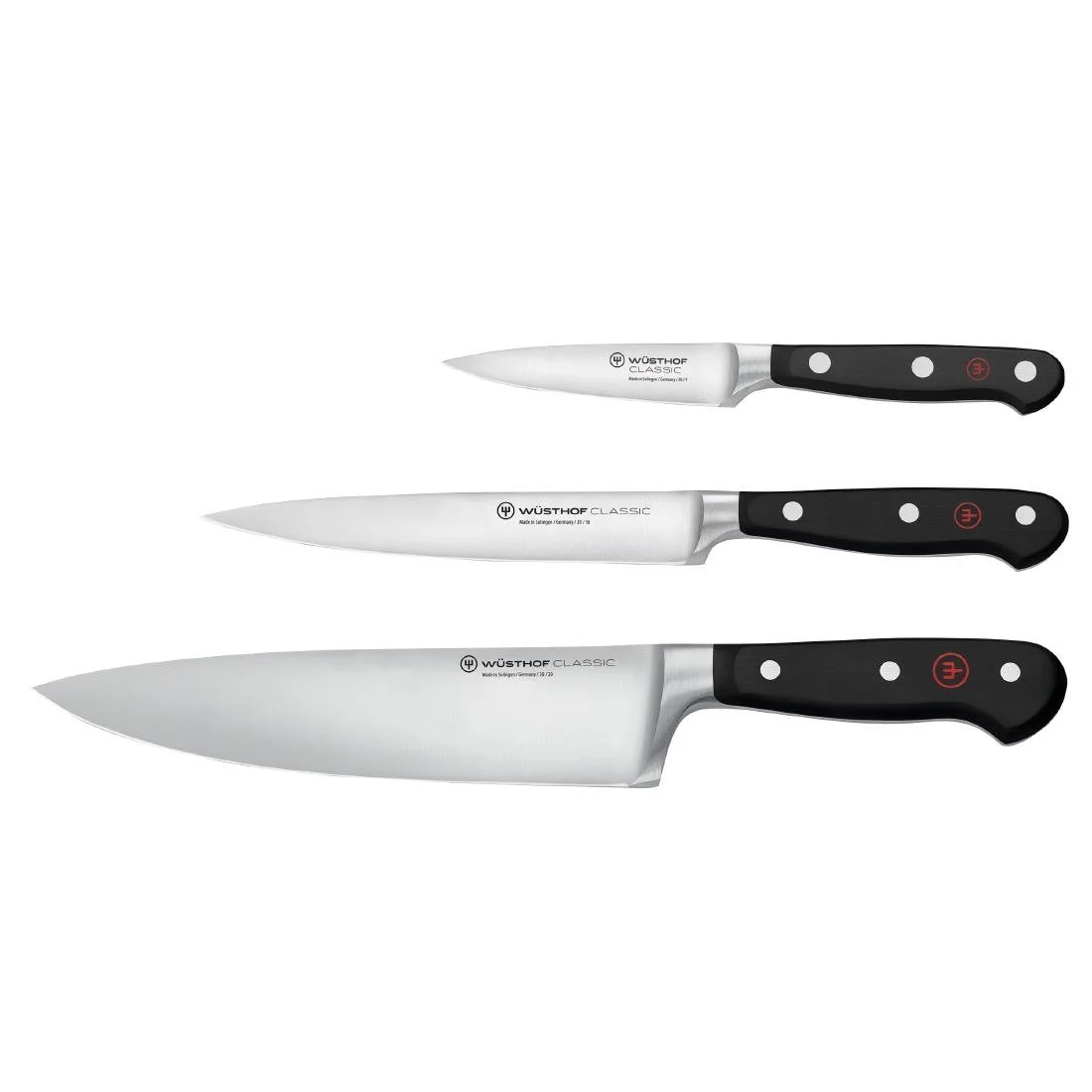 This 3-piece set from Wüsthof is the essential starter kit, consisting of the Chef’s Knife (workhorse of the kitchen), Utility Knife (versatile knife for smaller vegetables and foods), and Paring Knife (all-rounder for detailed work, peeling and finely dicing).