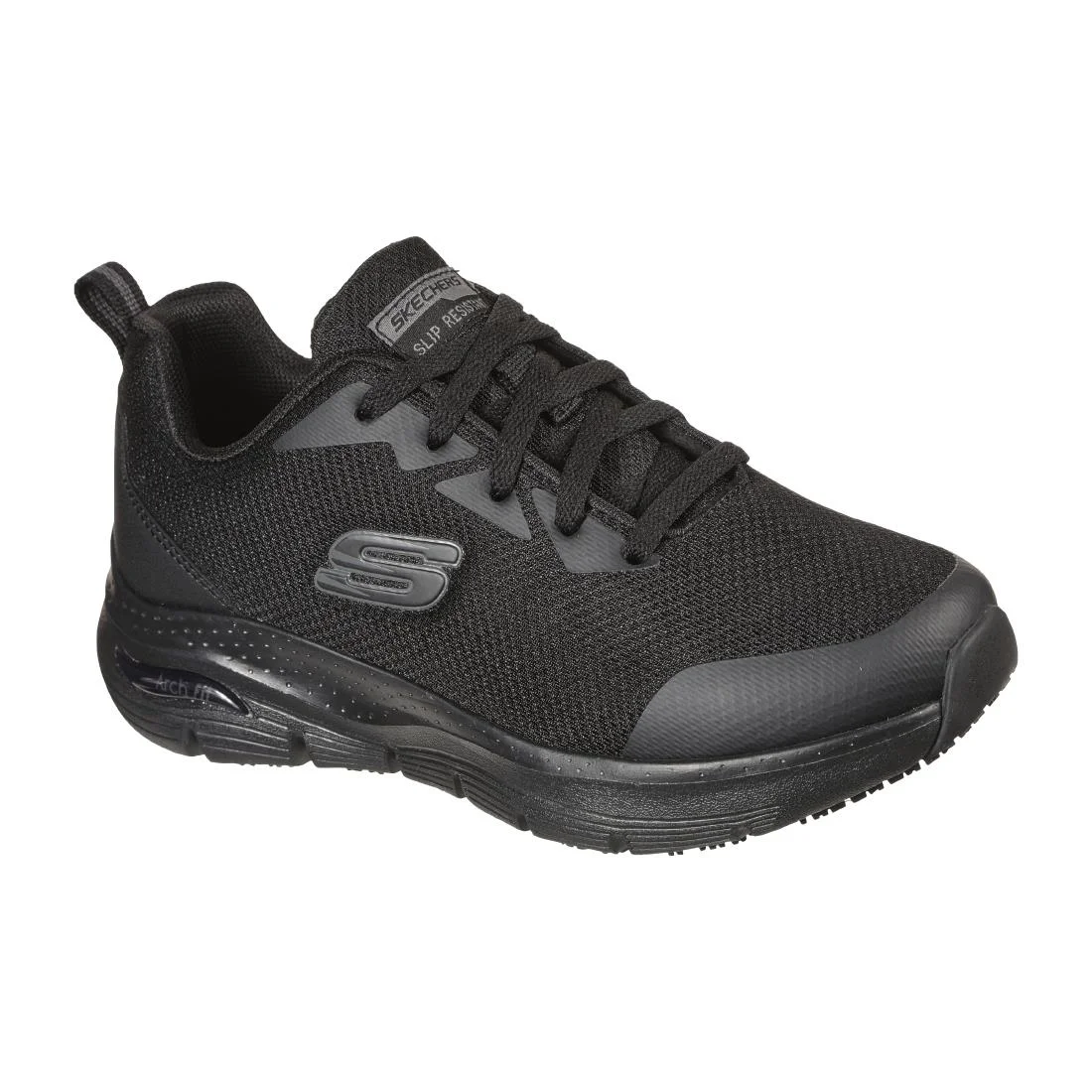 This slip-resistant work sneaker features a lace-up front in a durable mesh knit fabric and synthetic upper. Patented Skechers Arch Fit(R) insole system with podiatrist-certied arch support
