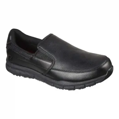 Work smarter and more comfortably with the Skechers Work Relaxed Fit(R): Nampa – Groton SR shoe. Smooth leather-textured synthetic upper in a slip on sporty casual comfort work slip resistant sneaker with stitching accents and Memory Foam insole.