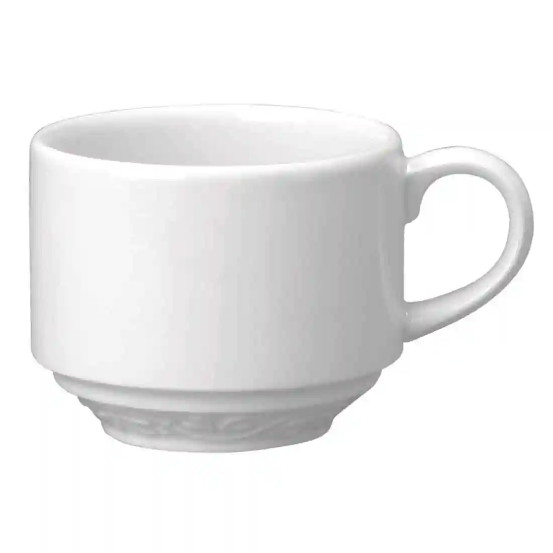 The Chateau collection features a contemporary elegant shape, delicately embossed with an Art Nouveau inspired intertwining leaf pattern around the rim. These stackable tea cups, as well as the full range of items available combined with the excellent durability and style; make the collection perfect for banqueting. All feature a fully glazed foot which help to prevent damage to the crockery when stacked.