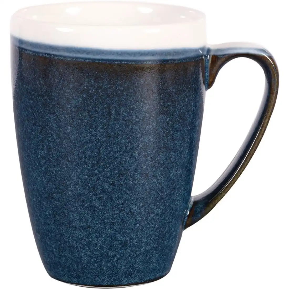 This tall and attractive mug from the Churchill Monochrome range combines a specked blue exterior and a tall white rim and gloss white interior to create a comforting mug for a range of coffees and hot chocolates. This contemporary mug complements a range of other Churchill products and is made to Churchill’s usual exacting standards, ensuring it is durable enough for extensive commercial usage.
