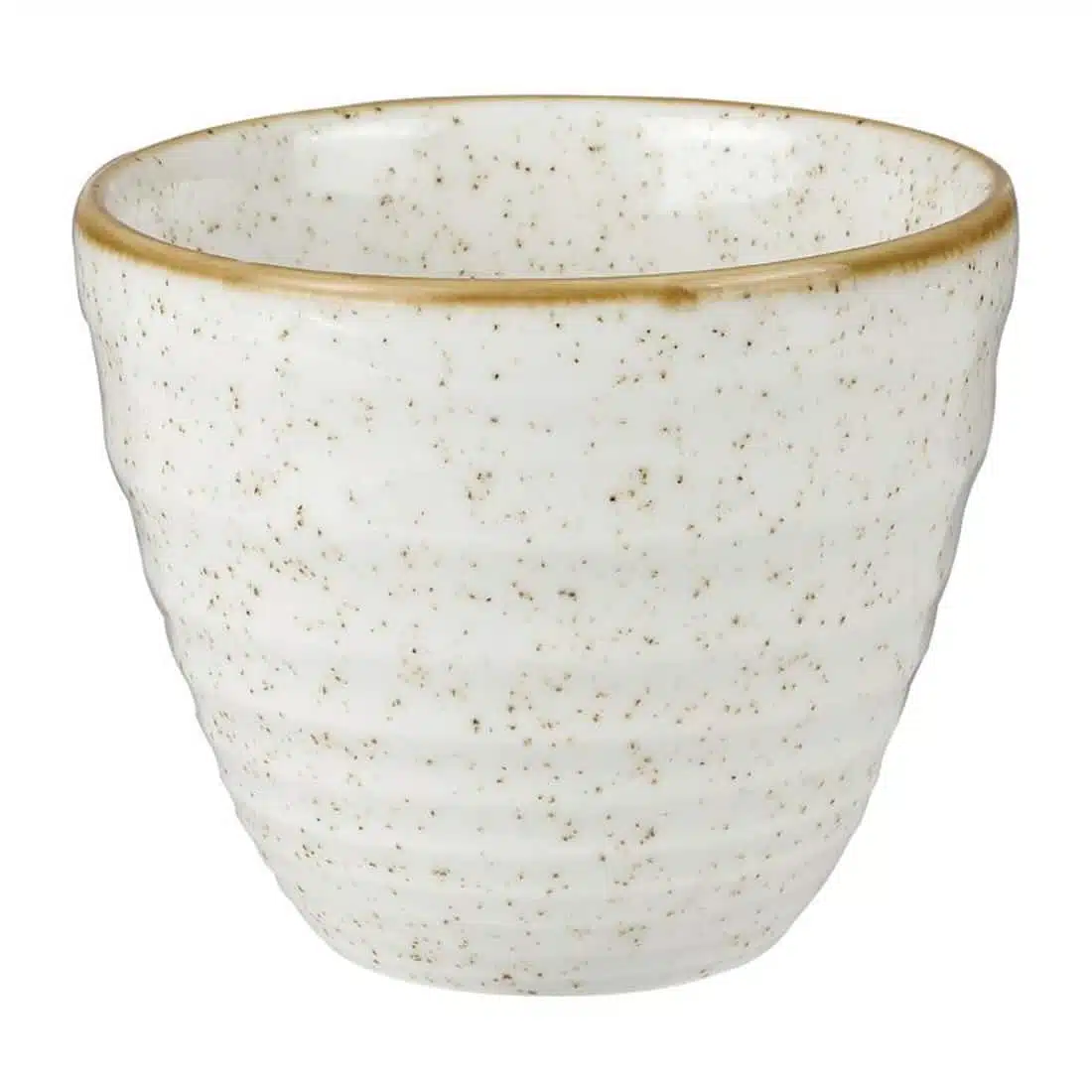 Don’t settle for ugly chips. This incredibly tasty guilty pleasure deserves a good looking home, and that’s where these chip mugs come in! Featuring a gloss white glaze with deliberate flecks and a dappled golden rim, these ridged pots can add glamour to any chip. Also perfect for thick sharing sauces such as guacamole or humus, these attractive pots are incredibly durable and hardwearing.