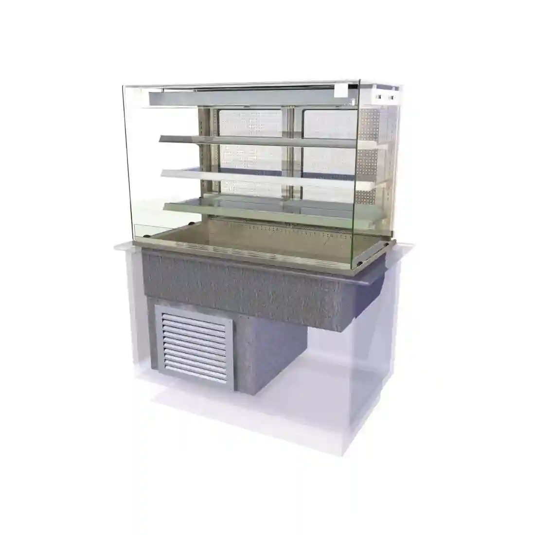 Illuminate, chill and display refrigerated food or drink with CED’s rectangular shaped Kubus self help cold multideck (Rear Doors). This energy efficient 3/1 GN size refrigerated display chills by hydrocarbon refrigerant (r290) – a solution that’s kinder to the environment and your budget. The rear loading self help multideck is designed for use in a free standing countertop and fitting the air grills and rear vent supplied, provide the ventilation needed for the underslung refrigeration condensing unit. Flat, toughened glass sneeze screen and side glass protection are provided to the customer side of the display. The display area features 3 no. chilled toughened glass display shelves, adjustable in both height and angle, providing increased cold product display area within a minimum footprint. The front edge of each chilled shelf features a product stop and 40mm tall ‘point of sale’ display/ticket strip. The 3/1 GN cold well area below the shelves provides further chilled merchandising. Product illumination is from diffused lighting in the rectangular profile gantry. The gantry also houses an eye level digital temperature display and ‘temperature lockable’ control panel, to operator side of the display. The multideck has 24 hour operation and holds food core between 2°C to 5°C. The display area has double glazed hinged rear doors for restocking and the self help superstructure is made from bright polished steel and aluminium rectangular profiles. Modular removable deck plates in the chilled multideck make for easier cleaning and an integral condensate water evaporator eliminates the need for site drainage. The display comes complete with air inlet grills, lifting kit and a 2m lead and plug top for installation.