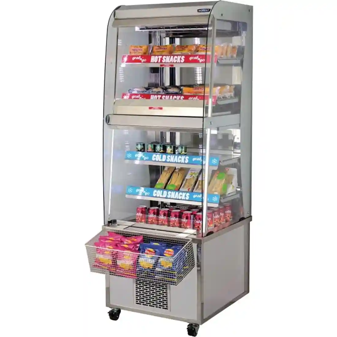 Hugely versatile, the Moffat MHC1 Merchandiser helps you to make the very most of the available room by combining hot and cold food display in one space-saving unit. Ideal for service stations, sandwich shops, convenience stores and more, the MHC1 offers two heated shelves and three chilled shelves – all lighted with efficient and eye-catching LEDs. Temperature is regulated by the highly accurate digital thermostat, which ensures food is kept at the perfect serving temperature. A great solution for promoting meal deal offers as well as grab-and-go type snack food. Supplied with a front mounted impulse purchase basket which is ideal for ambient snacks such as crisps, confectionary or cereal bars.