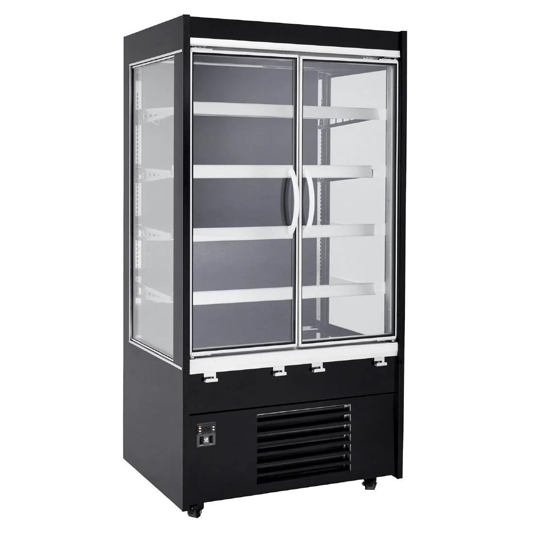 - Glazed side panels for increased display area