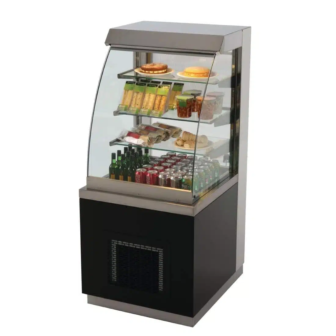 Refrigerated Display with a variety of sturdy features, including a toughened curved glass screen with a unique and drop-down rear door arrangement. Not only guaranteed to provide the attractive, tempting refrigerated display of your best-selling products, this Victor Optimax refrigerated display unit also features a unique rear door arrangement which helps maintain cabinet temperatures when doors are opened. Its stainless steel recessed top with removable recessed well for service access and effortless cleaning also demonstrates the highly user-friendly attributes this display chiller possesses.