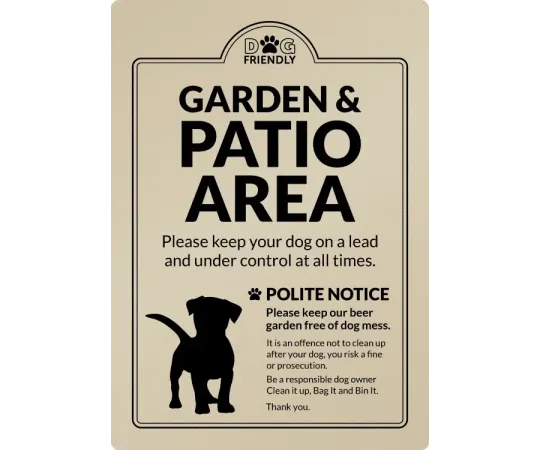 Dog-friendly garden and patio area notice to all pub and restaurant goers.