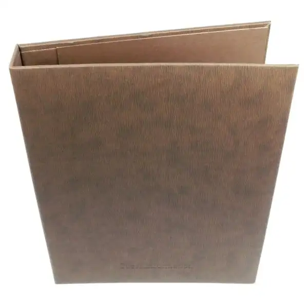 The material of this particular hotel compendium folder is stretched and bound over a heavy weight board. The pattern in the material resembles tree bark and is available in several earthy colours.