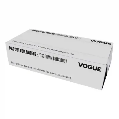 Versatile, practical and budget-friendly, these 270(W) x 300(L)mm Vogue aluminium foil sheets are the perfect choice for both commercial and domestic kitchens. Supplied in a pack of 500 pre-cut sheets, the aluminium foil is quick and easy to dispense – whilst lasting through many services without the need for restocking.