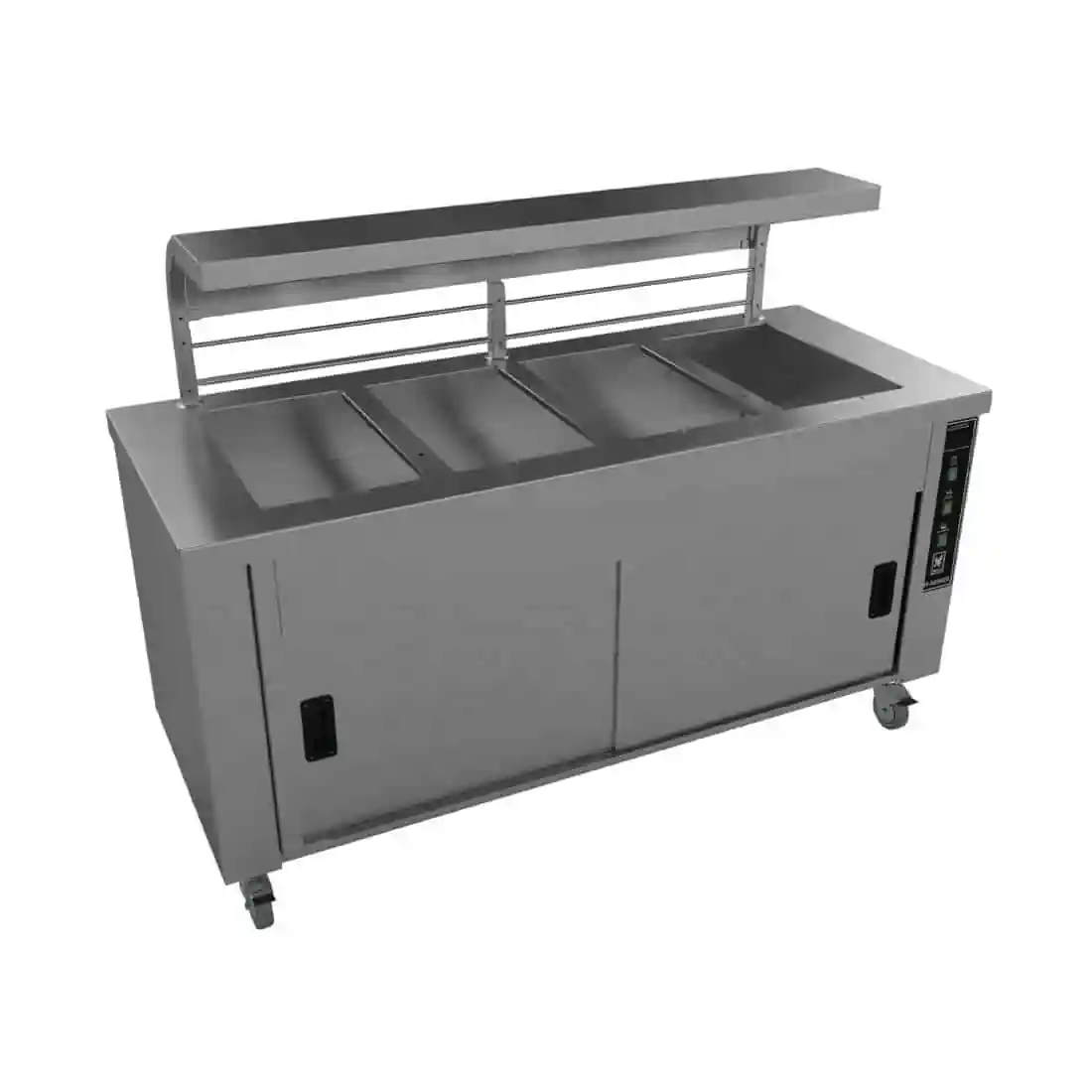 Featuring four separate full size gastronorm compatible wells, the high quality HS4 Falcon Chieftain heated servery counter is designed for the most demanding of commercial catering environments such as hospitals, prisons and schools. The top wells provide dry heat and are protected from cross-contamination by the supplied separating panels, whilst the hot cupboard itself provides ample storage of either plated meals or plates. The heavy duty overhead gantry is robust and features grid protected quartz lamps as standard.
