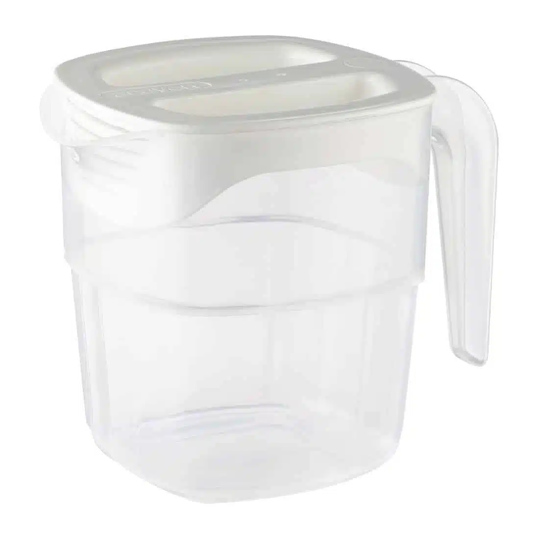 Jug with practical locking/pouring reverse lid design. Rectangular shape with tilting lid, ideal for storing liquids in fridges. Freezer, glasswasher, dishwasher and microwave safe.