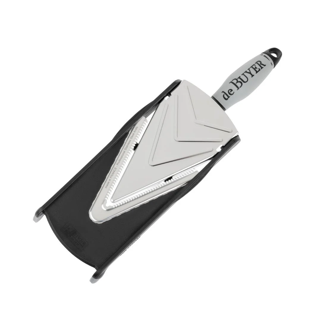 Double sided stainless steel blade. Nylon handle.