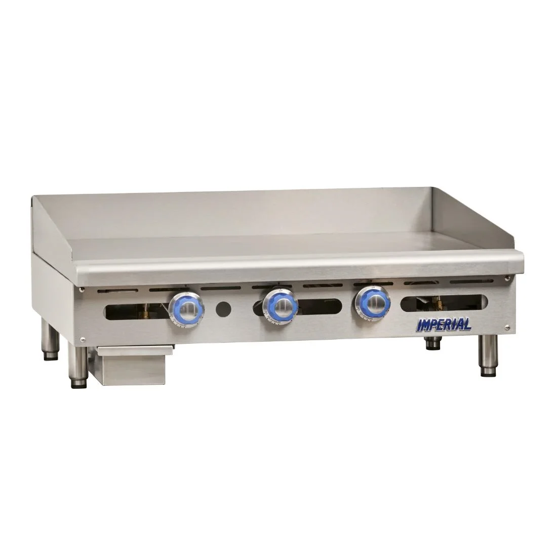 The gas Imperial ITG-36 countertop griddle is equipped with 3 griddle burners with individual, adjustable gas valves and continuous pilots for instant ignition. Aeration baffles between the burners, along with the full width rear flue, evenly distribute heat across the entire griddle plate for exceptional cooking results. The 1″ thick, highly polished steel griddle plate […]