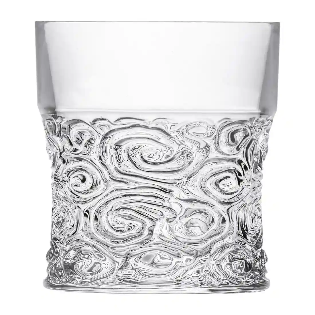 Exceptionally sturdy and resistant, these double old-fashioned tumblers from RCR Cristalleria’s Soul collection have a split design, with half of the glass decorated and the other half smooth.