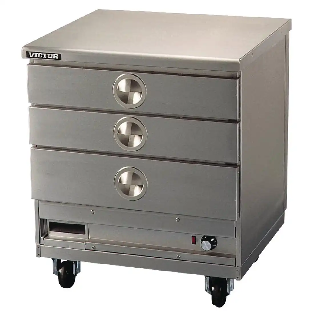 Heavy duty free-standing heated drawers, ideal for storing hot food before its needed. Food is kept in GN containers in each drawer, which have hot air circulating and an integral water tray. Made from stainless steel, it features thermostatic control, swivel castors, removable drawers and fan-assisted heating. Ideal unit to be sited next to an existing servery, back bar or prep unit.