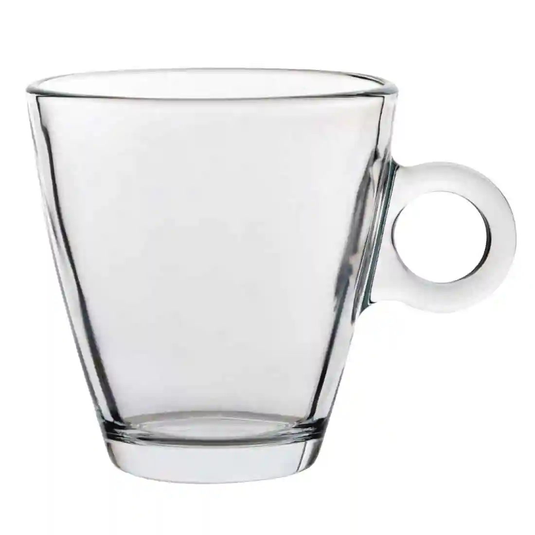 Glass cup with handle for use at hot drink service. Glasswasher safe and toughened for heightened resistance to thermal shock.