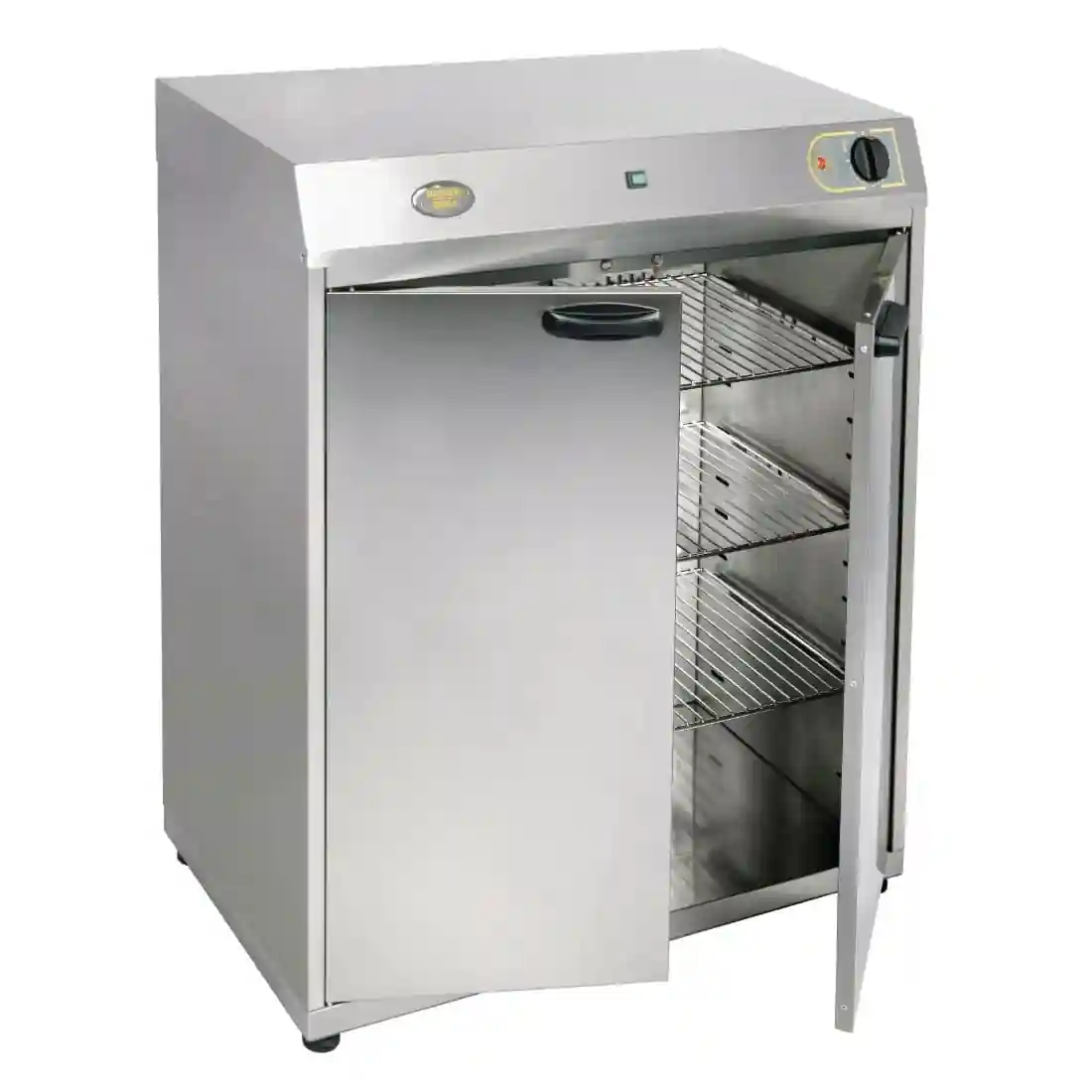 Ventilated hot cupboard with double insulated walls to keep warm empty plates or prepared food. Features protected element, fan and water tray for humidity control.