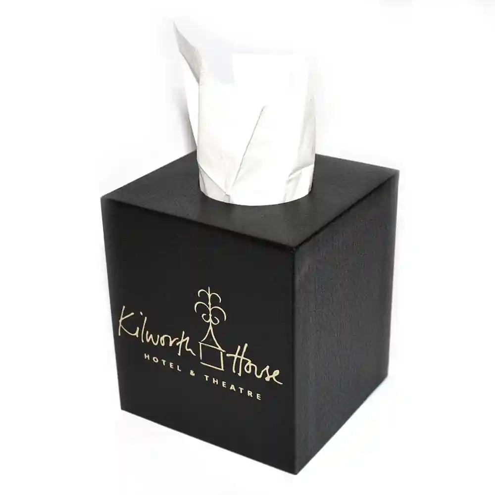 These can be covered in a range of bonded leather material in different grains and colours, in either a cube or oblong shape, and can also be fully personalised with your venue’s logo. These Tissue Box Holders are an ideal way to cover plain tissue boxes in your guest rooms, and can add a splash of colour and branding to your rooms, they are an ideal hotel room accessory. Call our Sales Team today for more information about these Tissue Box Holders, fabric swatches, colour options and artwork options.
