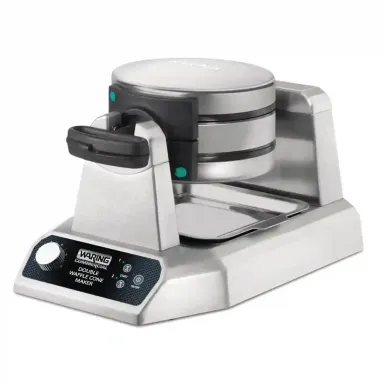Add value to ice cream by serving it with premium ice cream cones using the Waring double ice cream cone maker. Perfectly suitable for use in ice cream parlours, mobile catering outlets and leisure outlets, the Waring ice cream cone maker can easily produce up to 120 deliciously crisp cones every hour. The non-stick plates ensure great quality cones, whilst the adjustable timer helps to prevent waste, producing consistent results every time. The Waring cone maker is very easy to clean thanks to its removable drip tray and stainless steel construction. Includes handy cone roller.