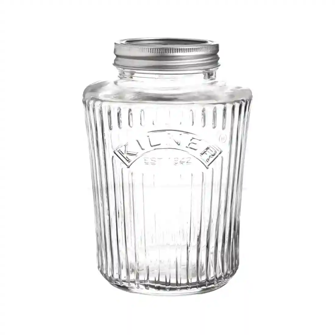 New Kilner ribbed vintage preserve jarm features a silver-coloured easy to use metal screw top lid, made up of two pieces, a replaceable vaccum seal and a metal screw band to secure the lid.
