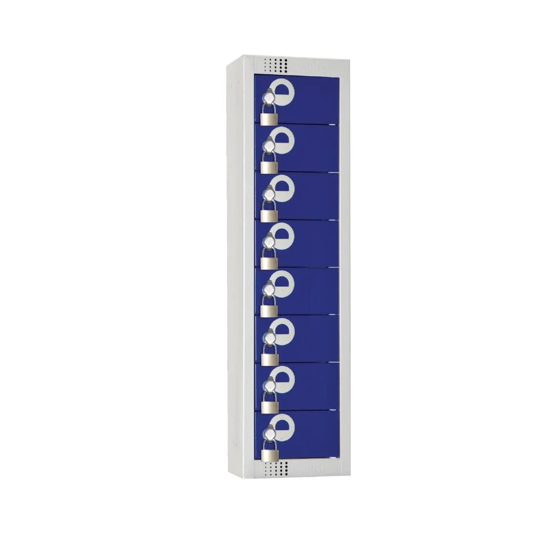 Eight door lockers, designed for use off floor. Anchor against a wall on a load bearing raised platform. Ideal for the storage of all personal effects, including watches, personal jewellery, wallets, purses and mobile phones.