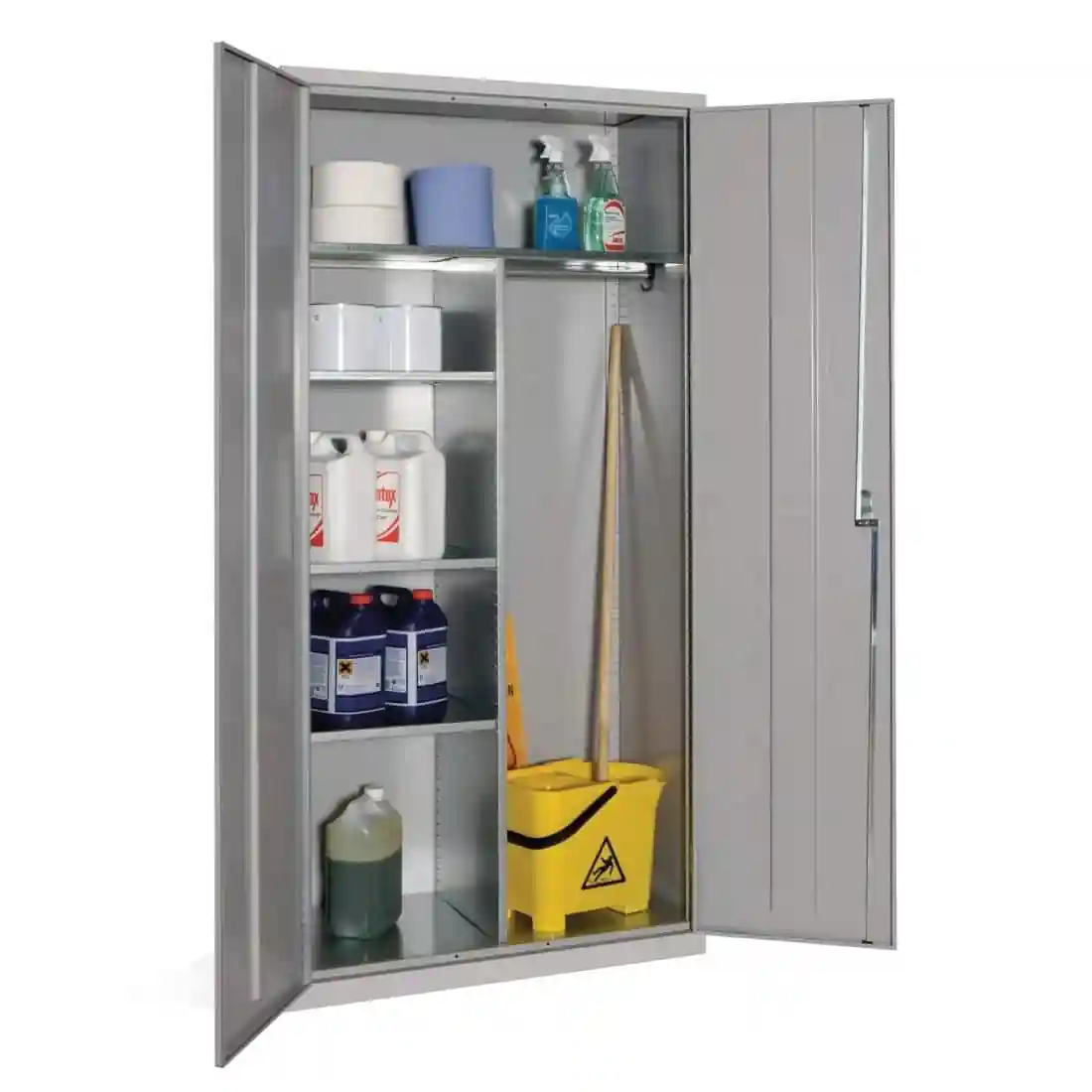 Robust mild steel lockable cupboards, standard models supplied with hardwearing galvanised shelves, great for storing equipment. Shorter model with one shelf for additional storage. Janitorial cupboard ideal for storing cleaning equipment etc.
