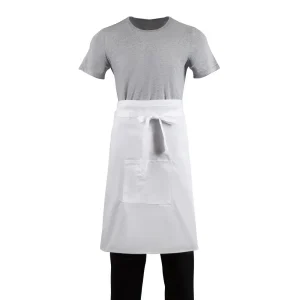 Hardwearing polycotton regular white bistro waist apron with pocket and matching sewn in ties. This is the ideal simple apron for any waiter or waitress.