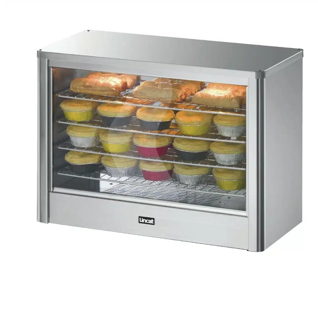 Attractive heated display unit for pies, sausage rolls or pizzas. Insulated sides and top for efficient operation keeping food at serving temperature.