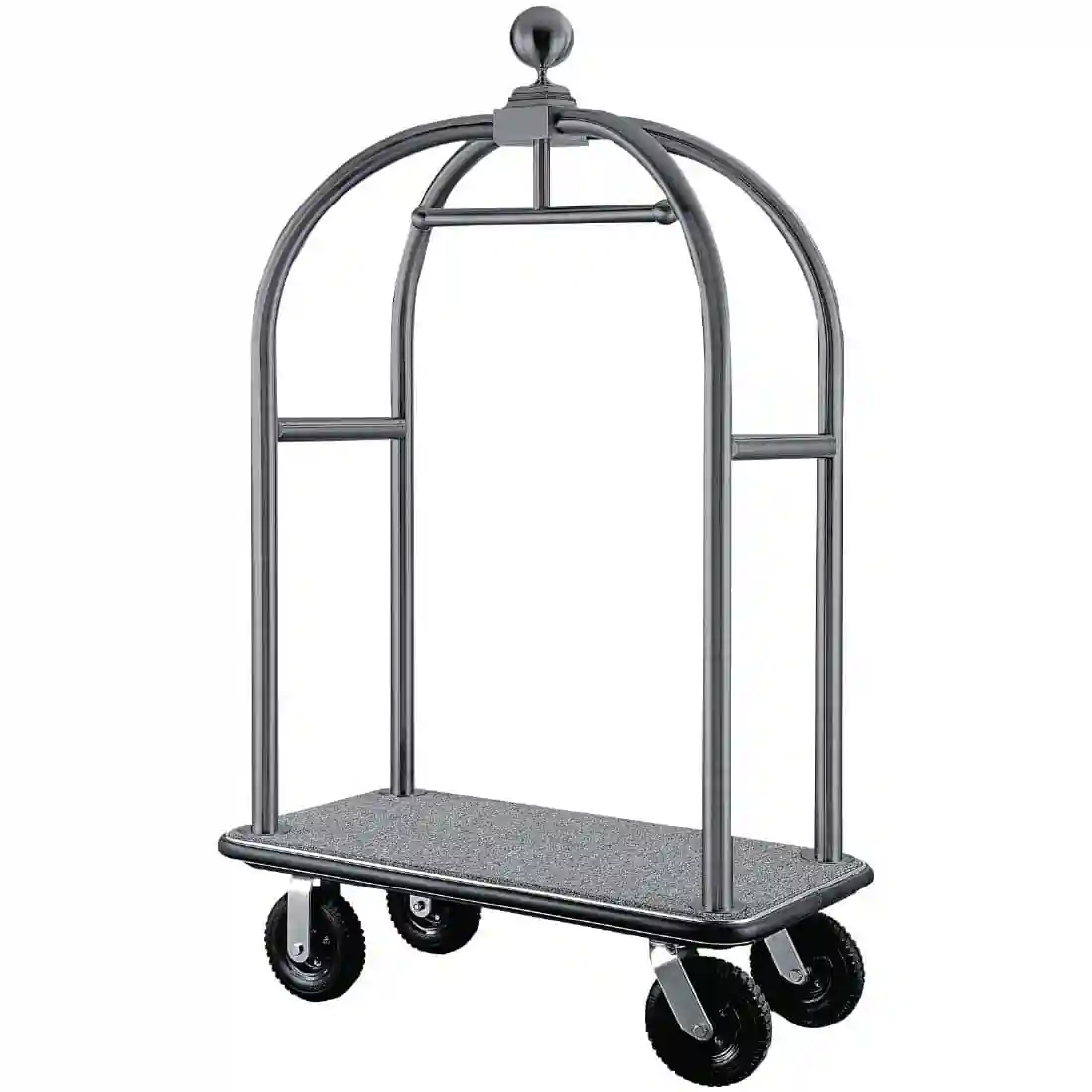 Contemporary and elegant brushed stainless steel trolley suitable for use in public areas. High load capacity for easy transportation of heavy luggage with 4 wheels: 2 swivel and 2 fixed. Grey carpeted loading base and protective bumpers help to protect luggage.