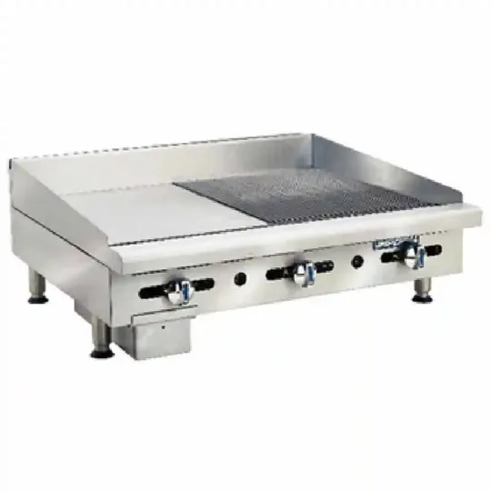 Thermostat controlled propane gas griddle by Imperial, designed to allow effective heat flow across the surface and maintain temperatures throughout cooking. Featuring; Plate with 610mm deep half ribbed, half smooth surface area, side and rear splashback with a removable grease trough for easy cleaning.