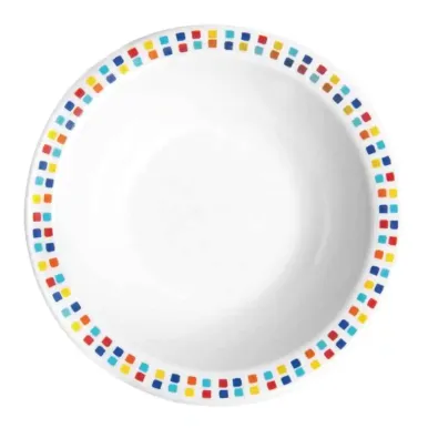 Melamine is a strong, lightweight and hard, thermosetting plastic which is an ideal hygienic and durable alternative to china. These bowls by Carlisle feature a white body with a multi-coloured mosaic effect around the rim; they are perfect for meeting the tough demands of everyday use in schools, hospitals and care homes.
