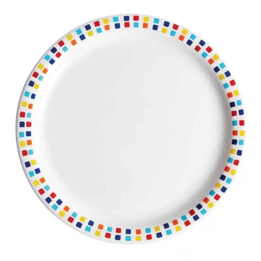 Melamine is a strong, lightweight and hard, thermosetting plastic which is an ideal hygienic and durable alternative to china. These dinner plates by Carlisle feature a white body with a multi-coloured mosaic effect around the rim; they are perfect for meeting the tough demands of everyday use in schools, hospitals and care homes.